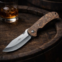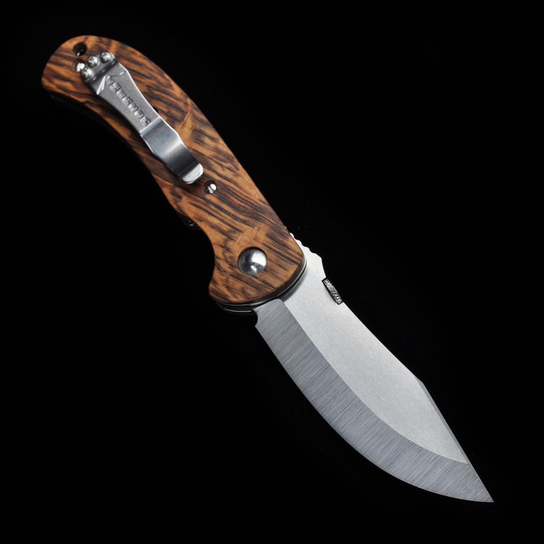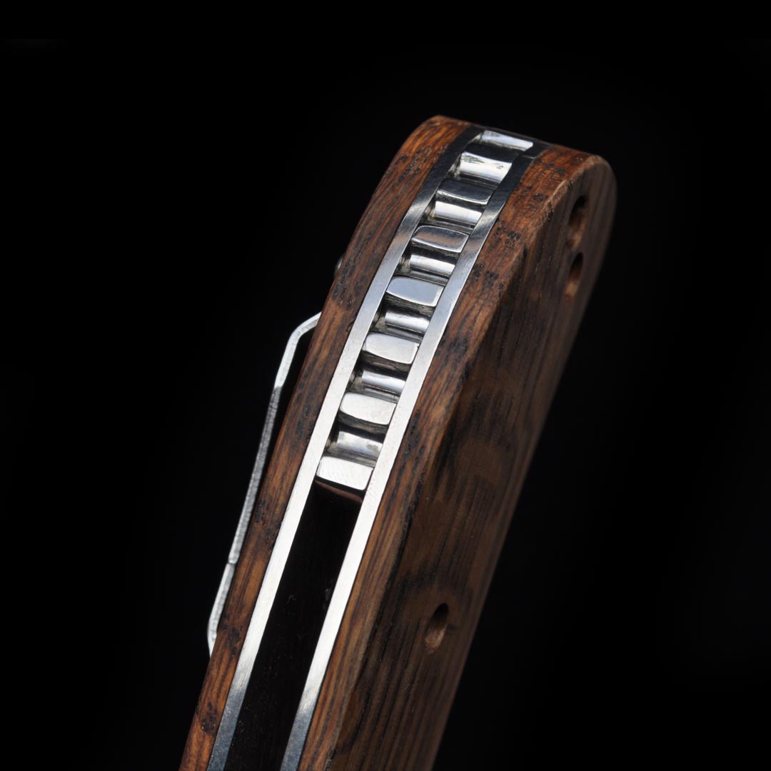 This one features mirror polished liners and hardware along with our polished titanium “Tank Tread” backspacer. With enough blade to do any kind of work, the larger belly definitely has a “hunteresque” flavor. This Super Custom Prototype is adorned with beautiful whiskey stave oak handles and is definitely a real stunner.